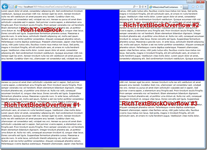 As you can see from this screenshot, we had a RichTextBlock in the upper left and its content overflowed onto the RichTextBlockOverFlow #1, #2 and #3. You can think of this as something that is similar to a newspaper article. As the browser expands or contracts the content fills the available area.