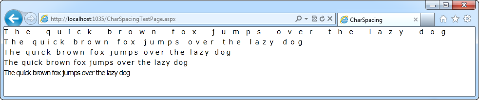 The TextBox and TextBlock controls provides a way to control the spacing of letters inside the text very easily. Let’s go ahead and take a look at a screenshot of the various character spacing inside of a TextBlock.