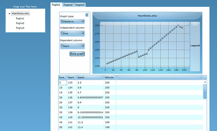 A DataGrid overtopped by a Chart and an Expander Control are put on each tab. The DataGrid is filled up with the data contained in the sheet selected, assuming that the first row contains the headers of the columns (I recognize this is a very rough simplification). At this stage you can either build a graph using the options contained in the Expander Control (i.e. choosing the independent column and the dependent column and then pressing the button “Build”) or drag & drop items of the rows selected from the Datagrid to the Chart. Actually, this last operation is a bit tricky due to the standard behaviour of the Datagrid: you have to click on the first row of the selection you want and, keeping pressed the shift key, click again on the final row of your selection and finally without releasing the left mouse button drag the selection just created and drop it on top of the Chart. The Chart will be populated with all the data suitable found in the selection.