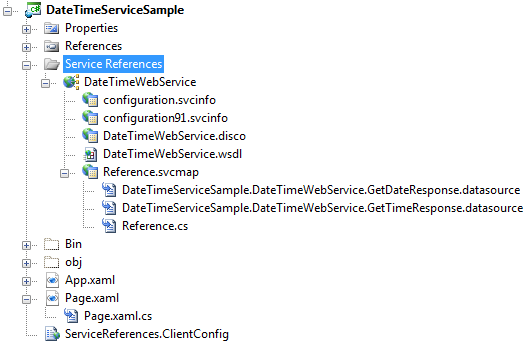 By clicking “OK” we have a reference to our service added in the Silverlight project. Visual Studio generates all the WSDL (see the FAQ section at the end of the article) you'll need to call the service in several files.