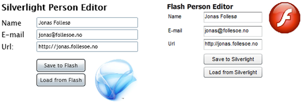 The Flash ExternalInterface API and the Silverlight HTML gives us the building blocks we need to start passing data between a Silverlight and Flash application running on the same page. For this example we’re going to create a simple user interface to edit a person in both Flash and Silverlight. The interface looks something like this: