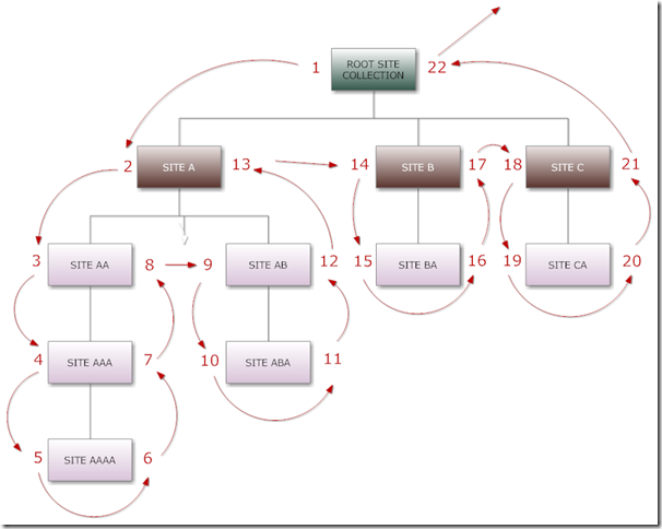 In the previous paragraph I explained the reason why I want to put the hierarchy into a Custom Sharepoint List: it can be read also by anonymous users. The problem is that a List in Sharepoint is basically a table with rows and columns, while the IHierarchicalEnumerable object that we have obtained represents a tree hierarchy. How to save a tree-hierarchy in a table then? After a moment of despair I recalled an old article entitled Storing Hierarchical Data in a Database that illustrated an algorithm called Modified Preorder Tree Traversal. The principal assumption of the algorithm is that each node in the hierarchy tree must have a left value and a right value. Then the tree is traversed assigning opportune values for left and right according to the rules shown in the flowchart below: