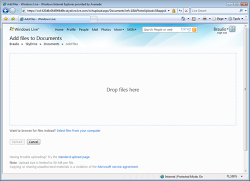 Now that we have covered the basics, let’s go a for a more advanced sample, Do you have an Ms Sky Drive account? It offers great file storage on the “cloud”, you just select a set of files and upload them to your private drive space, some time ago they implemented a really useful feature, instead of use the file open dialog, let the users upload files by dragging them from their desktop to this web application (see snapshot below).