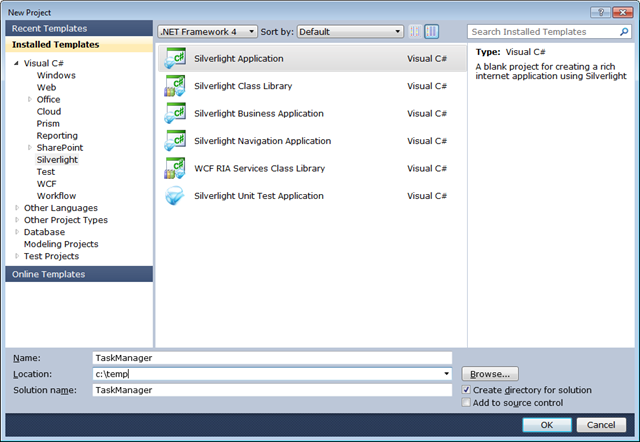 Create a new Silverlight Application project named TasksManager. You can use WCF RIA Services with any of the Silverlight project types, including the Silverlight Business Application template that is added by WCF RIA Services itself. But to start simple, I’ll go with just the Silverlight Application template.
